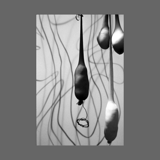 installation of drawings and sculpture - 7' - 8' steel poles with poly / nylon forms - 7.5' X 3.5' velum with ink drawings intertwined, 1996
